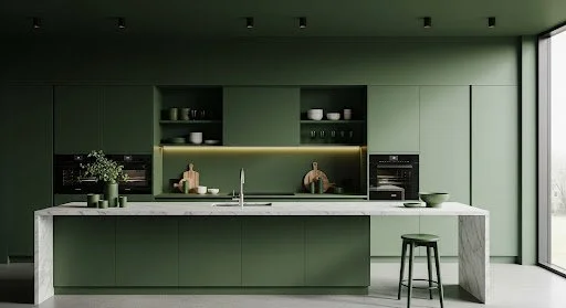 Instead of mixing cabinet colours, colour-drenched kitchens use one consistent tone across tall units, base units, islands, and storage walls. This creates a sleek, architectural feel and can actually make the space appear larger.