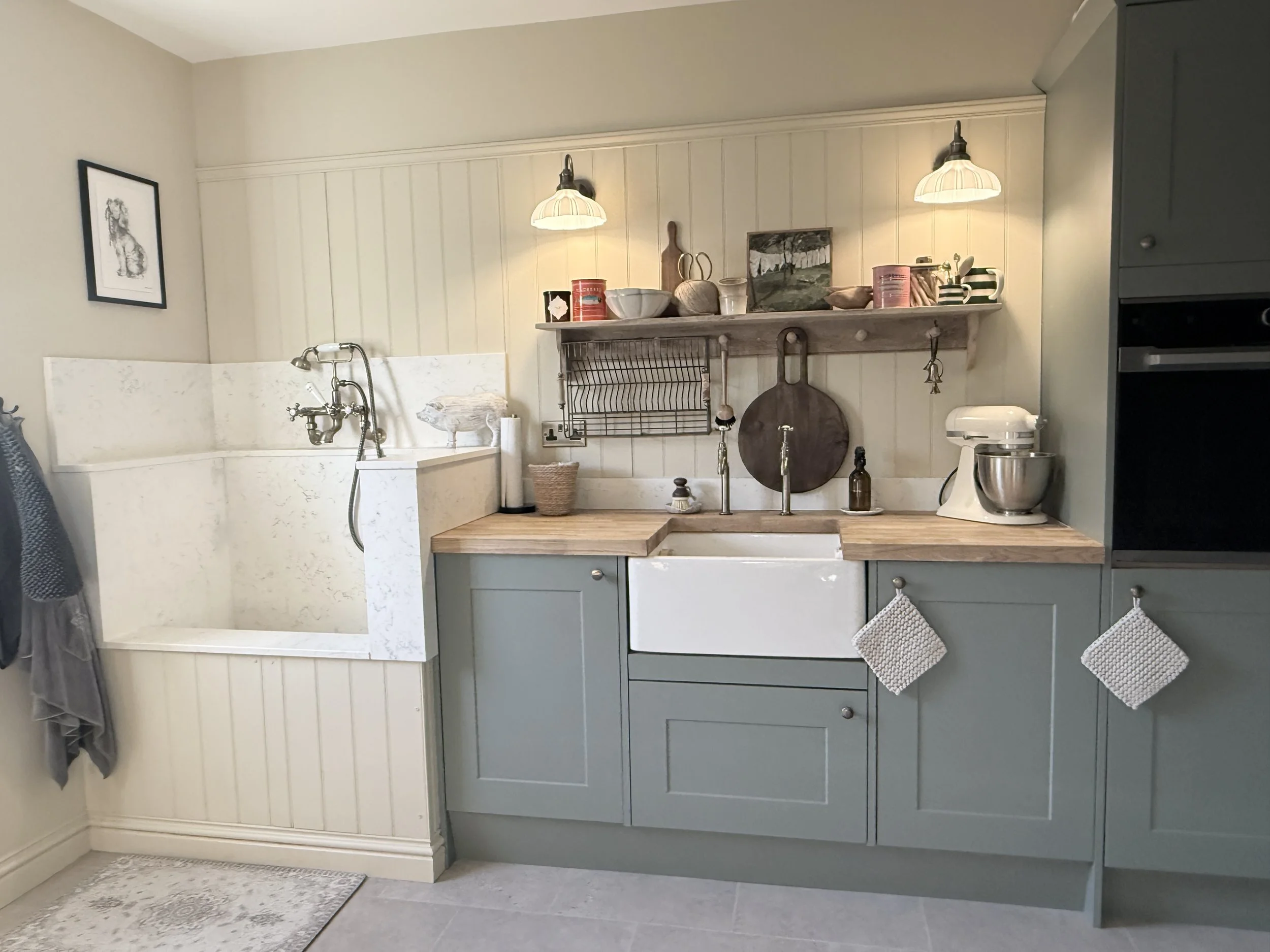 This beautifully designed kitchen and utility renovation in Harpole, Northamptonshire perfectly complements its picturesque village setting. Blending traditional charm with a modern twist, Saturn Kitchens transformed this space from functional to truly fabulous by undertaking a partial garage knock-through, creating a stunning and highly practical utility room. The new utility space is full of character and thoughtful details, including a bespoke dog bath and a classic farmhouse door, ideal for modern family living.
