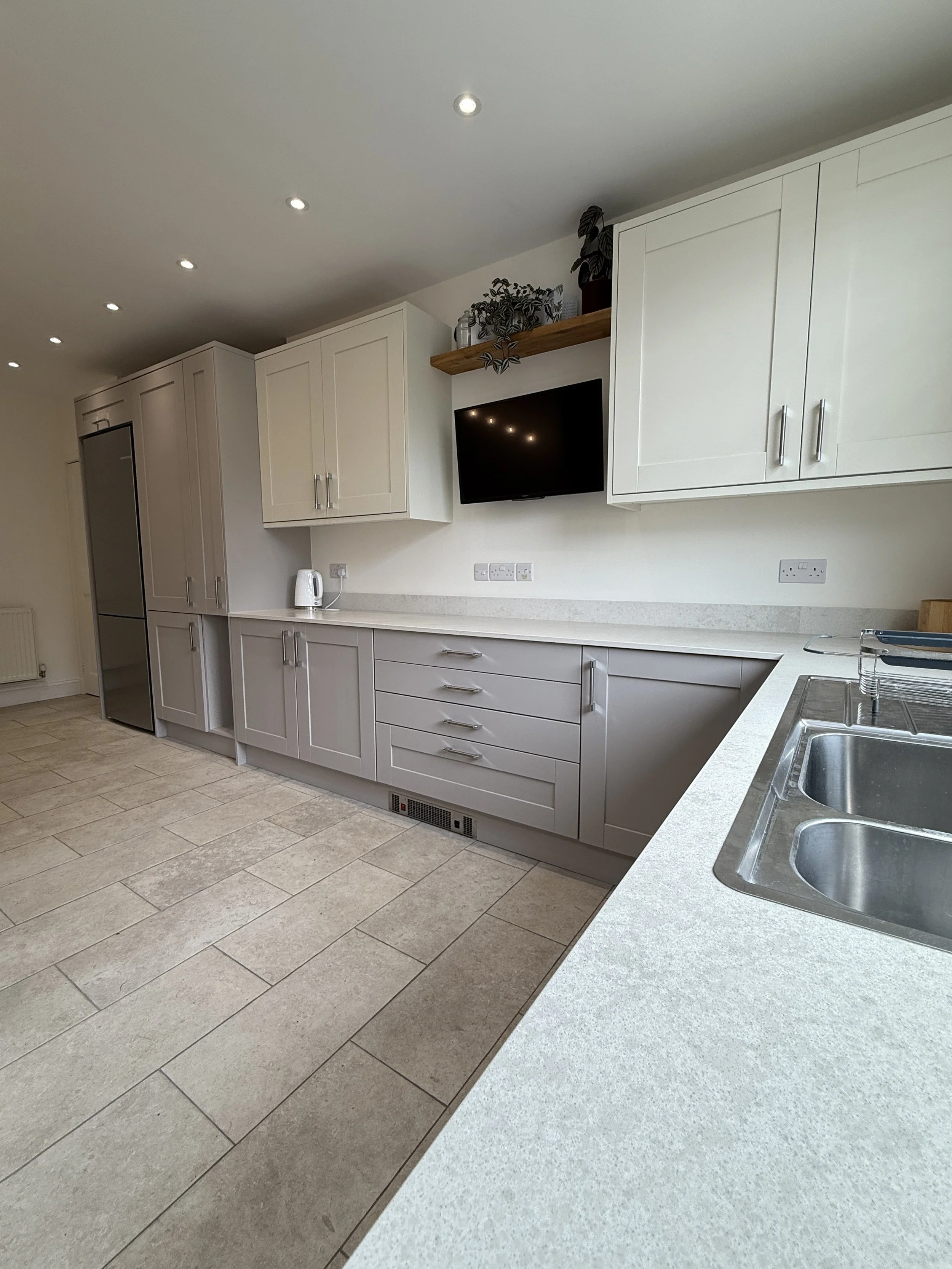 After many years since the Willey family had their extension built, they finally took the exciting plunge and converted it into their brand new, Shaker kitchen. They came to us to help them carefully achieve their specific kitchen goals. We worked closely with this lovely family over an extended period to ensure every aspect of the kitchen was perfectly tailored to their tastes and lifestyle. This included installing a secondary integrated fridge alongside their chosen freestanding fridge freezer, incorporating air conditioning for added comfort, and selecting a custom paint colour that complemented their home beautifully. They are absolutely delighted with the final results, and their whole family is now enjoying this wonderful new space for cooking, entertaining, and making lasting memories together.
