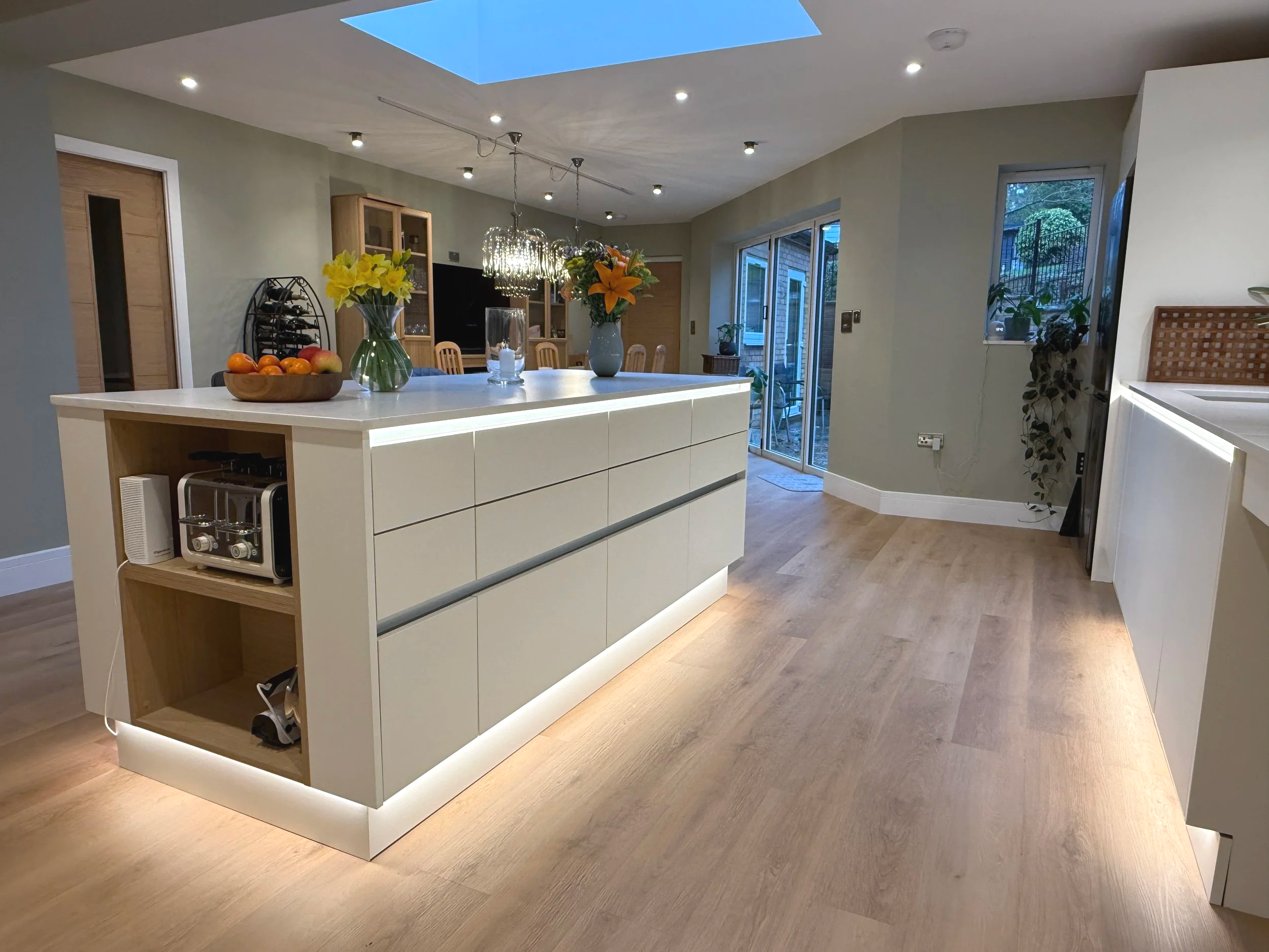 This exceptional bespoke kitchen renovation in Flore, Northamptonshire saw the Pask family entrust Saturn Kitchens and Interiors with the complete transformation of the ground floor of their home. The project began with the demolition of the existing kitchen and utility spaces to create an entirely new, thoughtfully designed floorplan tailored to both modern family living and accessibility needs.